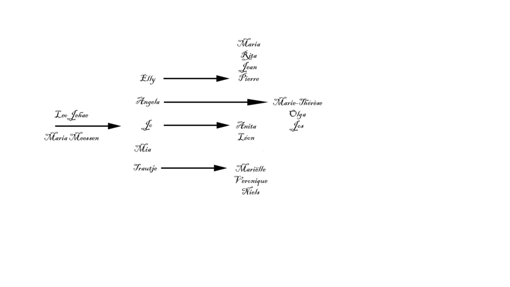 De kinderen Onze ouders Elly Jehae, Angela Jehae, Jo Jehae, Trautje Jehae en onze tante Mia Jehae. Elly Meertens – Jehae * 29-10-1929 † 11-01-2024 Angela Velraad – Jehae * 31-10-1930 † 02-08-2005 Jo Jehae * 31-12-1933 † 04-11-2003 Mia Jehae * 25-09-1937 † 08-06-2012 Trautje Van Proemeren – Jehae * 02-09-1942 † 07-10-2024